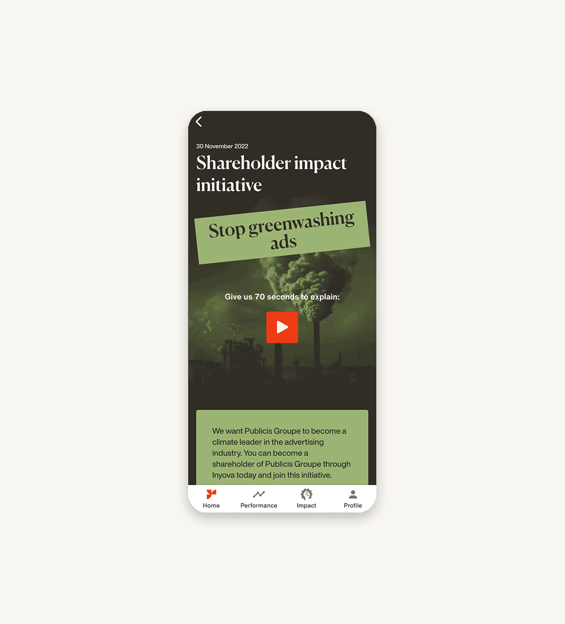 - Impact investing is about finding companies where shareholders can make an impact by lobbying for change. We believe that Publicis Groupe, if set in the right path, can have a major impact – not just by no longer deploying its creative services on behalf of fossil fuel companies, but also by acting as a pioneer and role model for the industry.