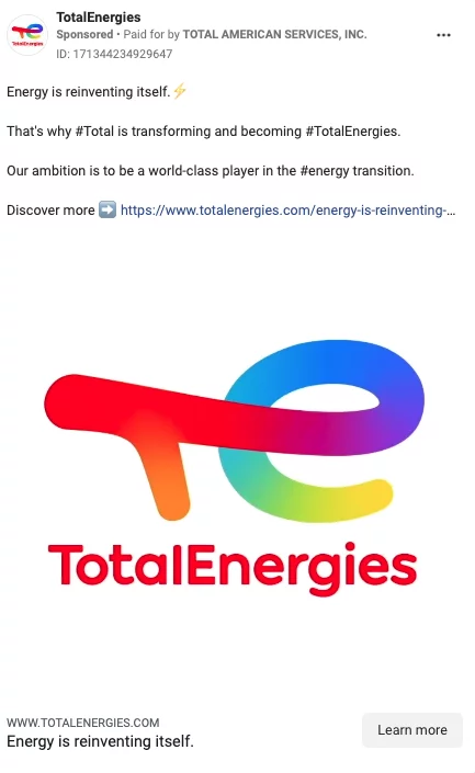 Over the last 40+ years, the fossil fuel industry has become increasingly concerned with its public image as a polluter. To counteract this perception, it has hired advertising and PR firms, like Publicis Groupe, to build a more favourable image of itself. Evidence shows that for companies like TotalEnergies, who contracted Publicis Groupe for their rebranding, only about 25% of new investments actually go towards renewable energy – yet 62% of their marketing claims are based on the company moving towards renewables. (Source)