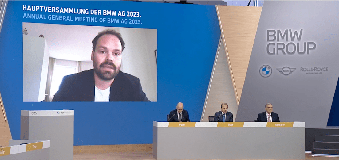 Following up on this initiative, Inyova’s Head of Impact delivered a live speech at the company’s AGM on 11 May 2023. We were able to pose critical questions concerning the proportion of BMW’s investments in combustion engines versus electric vehicles and will continue to push for more positive change at BMW.