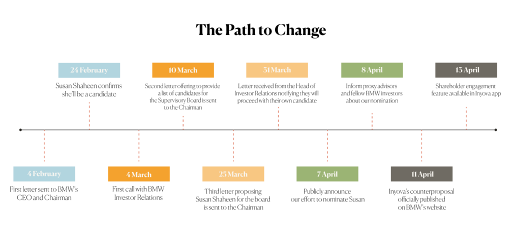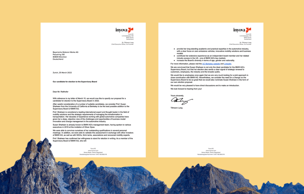 Inyova is filing an election proposal at BMW’s AGM suggesting to bring Susan onto BMW’s supervisory board instead of the candidate proposed by the company.