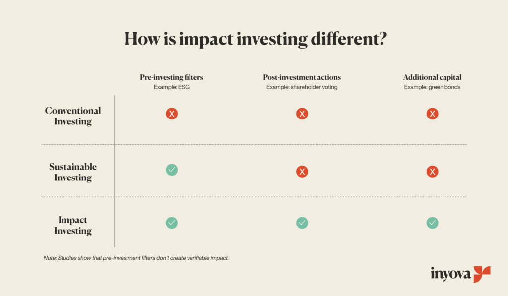 Impact investments differ from ESG-related sustainable investments in that they are designed to have a measurable impact on the real world. While for an ESG investment it’s sufficient to consider what a company you invest in does (by applying pre-investment filters), for an impact investment it’s crucial that the investment changes how that company interacts with the world—in other words, that the investment itself has an impact on the real world.
