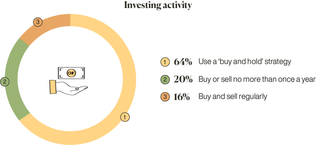 Additionally, 64% of the survey population are passive investors — they tend to ‘buy and hold’ as opposed to those who buy or sell regularly (16%). The top three investment choices are: Pillar 3a/retirement accounts (20%), savings accounts (20%), and the stock market (14%).