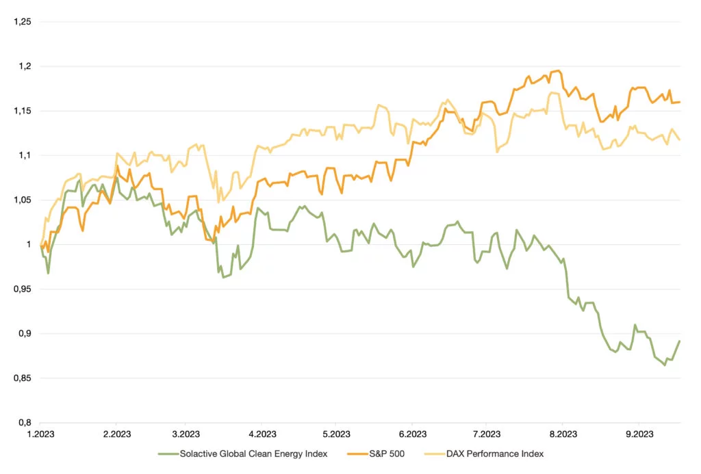 Bis Februar 2023 haben sich S&P 500, DAX 40 und der Solactive Global Clean Energy Index sehr ähnlich entwickelt. Seit Februar weichen die Entwicklungen jedoch voneinander ab. Während die Kurven des S&P 500 und des DAX 40 seither nach oben tendieren, verzeichnet der Solactive Global Clean Energy Index einen rückläufigen Trend. Dies unterstreicht, dass die hohe Inflation, die gestiegenen Zinsen und der Druck durch die Konkurrenz aus Übersee einen erheblichen und nachhaltigen Einfluss auf den Erfolg von Unternehmen der Clean Energy haben.