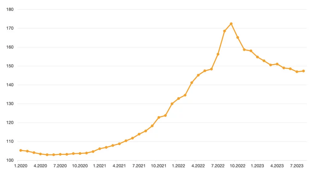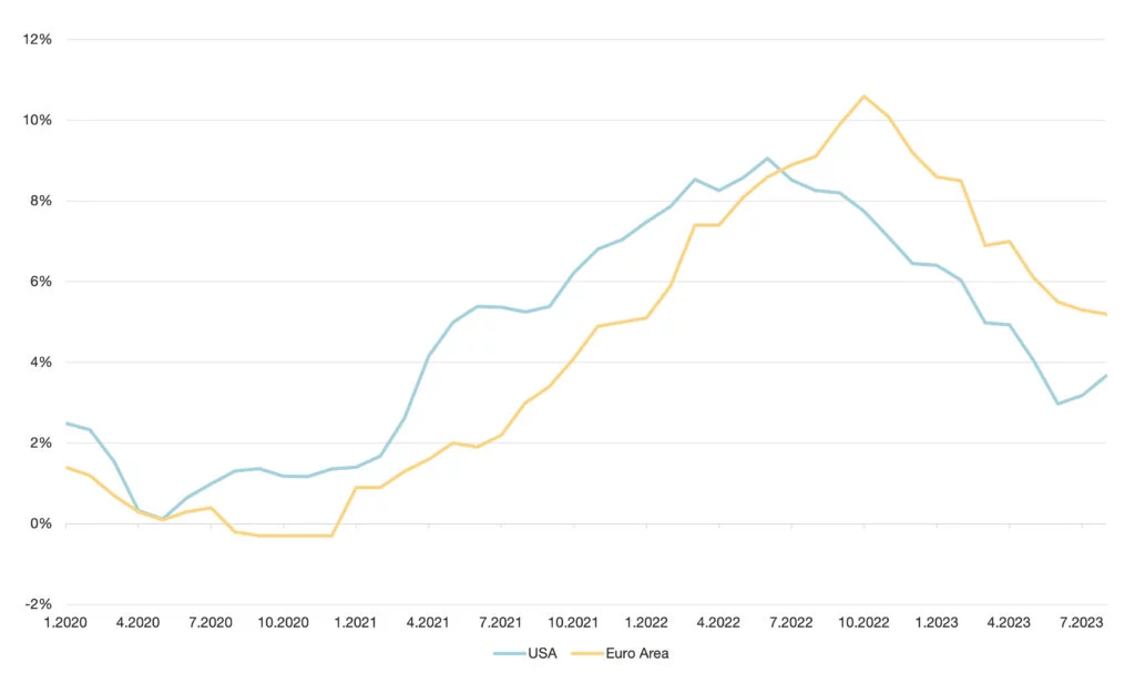Die Inflation in der Eurozone ging im August 2023 auf 5,2% zurück (5,3% im Juli). Obwohl die Inflationsrate seit November 2022 kontinuierlich gesunken ist, liegt sie immer noch deutlich über der von der EZB angestrebten Inflationsrate von 2%.