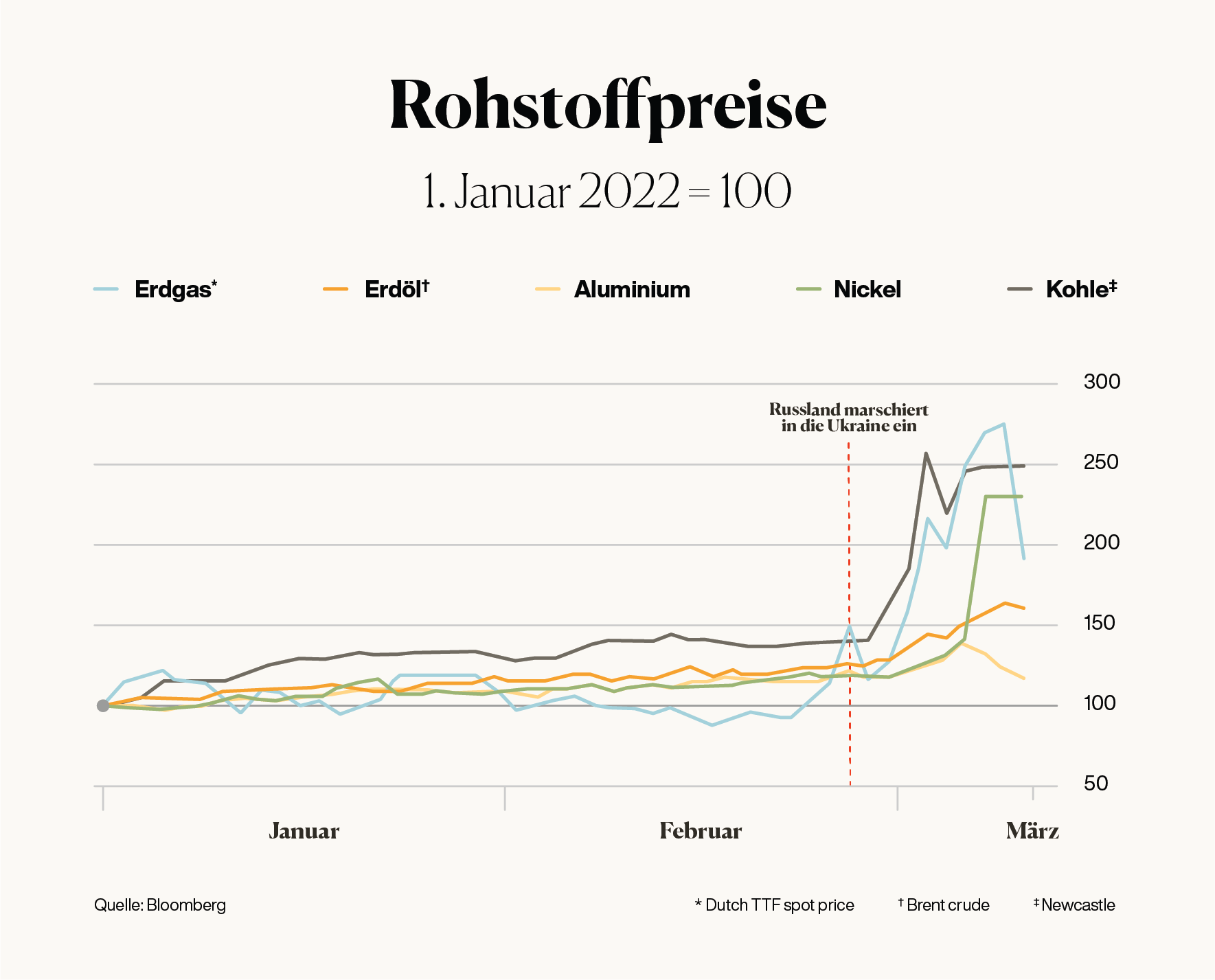 Seit Jahresbeginn sind die Rohstoffpreise in die Höhe geschossen – insbesondere Öl- und Gaspreise. Der Ölpreis ist um mehr als 50 % gestiegen, der Erdgaspreis hat sich nahezu verdoppelt.