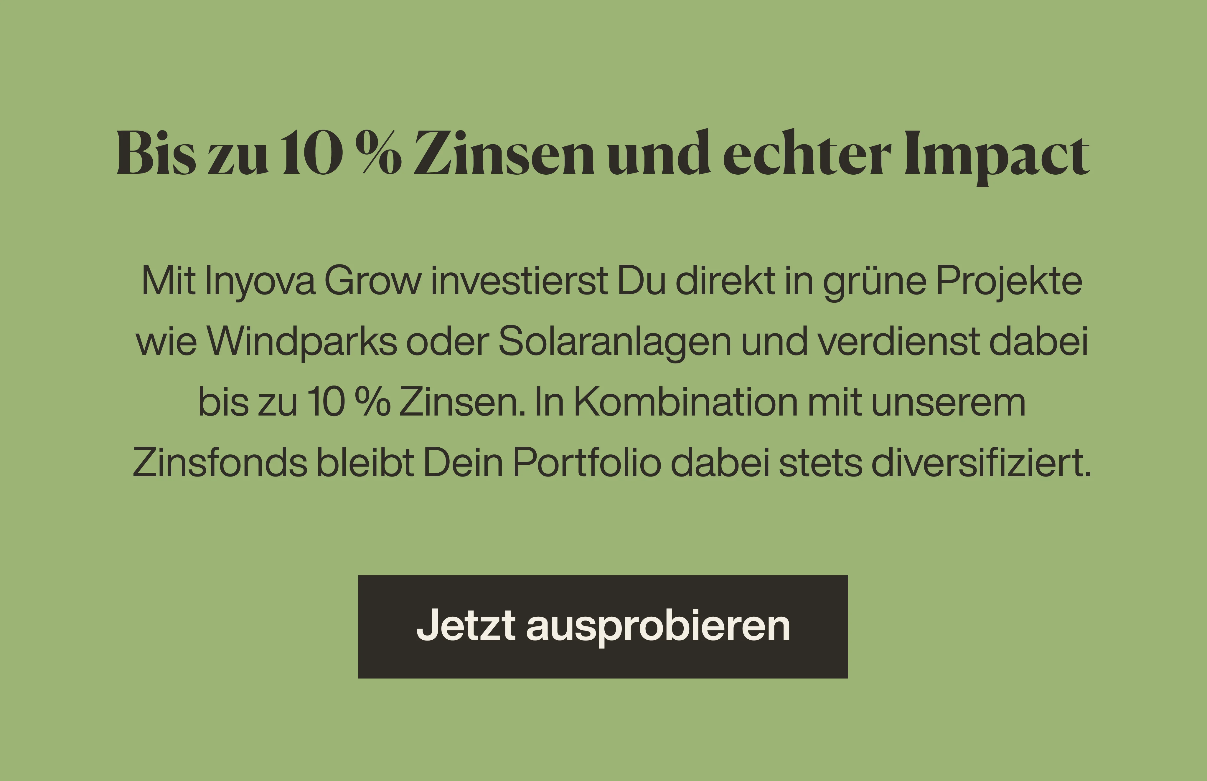 Kennst Du schon Inyova Grow? Mit unserer nachhaltigen Zinslösung kannst Du Dein Geld in grüne Projekte wie Windparks oder Solaranlagen investieren und dabei jährliche Zinsen von bis zu 10 % verdienen.