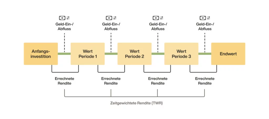 Der TWR unterteilt den Investitionszeitraum in Teilperioden, je nachdem, wann Ein- oder Auszahlungen getätigt wurden, und berechnet dann die Rendite für jede Teilperiode. Die Renditen für jeden Teilzeitraum werden mit Hilfe einer speziellen mathematischen Methode (Compounding) kombiniert, um die Gesamtrendite für den gesamten Anlagezeitraum zu berechnen.