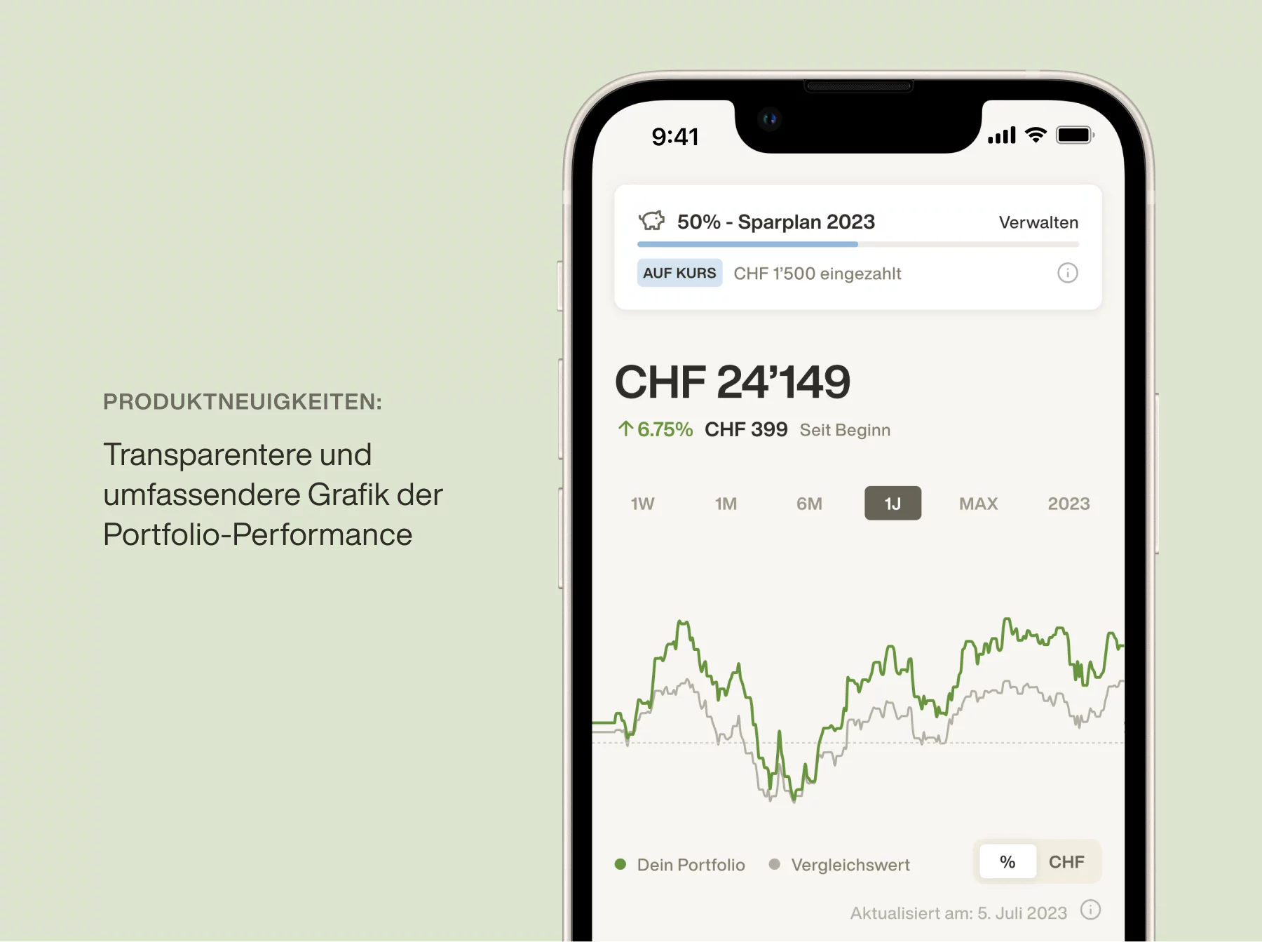 Als Teil des Updates haben wir auch den Performance-Graphen überarbeitet. Einige Details kommen Dir sicher bekannt vor. So siehst Du ganz oben Deinen aktuellen Portfoliowert, sowie die Entwicklung in Prozent und CHF. Diese Zahlen sowie der nachfolgende Graph basieren auf der zeitgewichteten Rendite (also der Rendite, die um den Effekt der Ein- und Auszahlungen korrigiert wurde). Im Graphen kannst Du zwischen verschiedenen Zeiträumen, und zwischen der prozentualen oder Wertveränderung wählen.