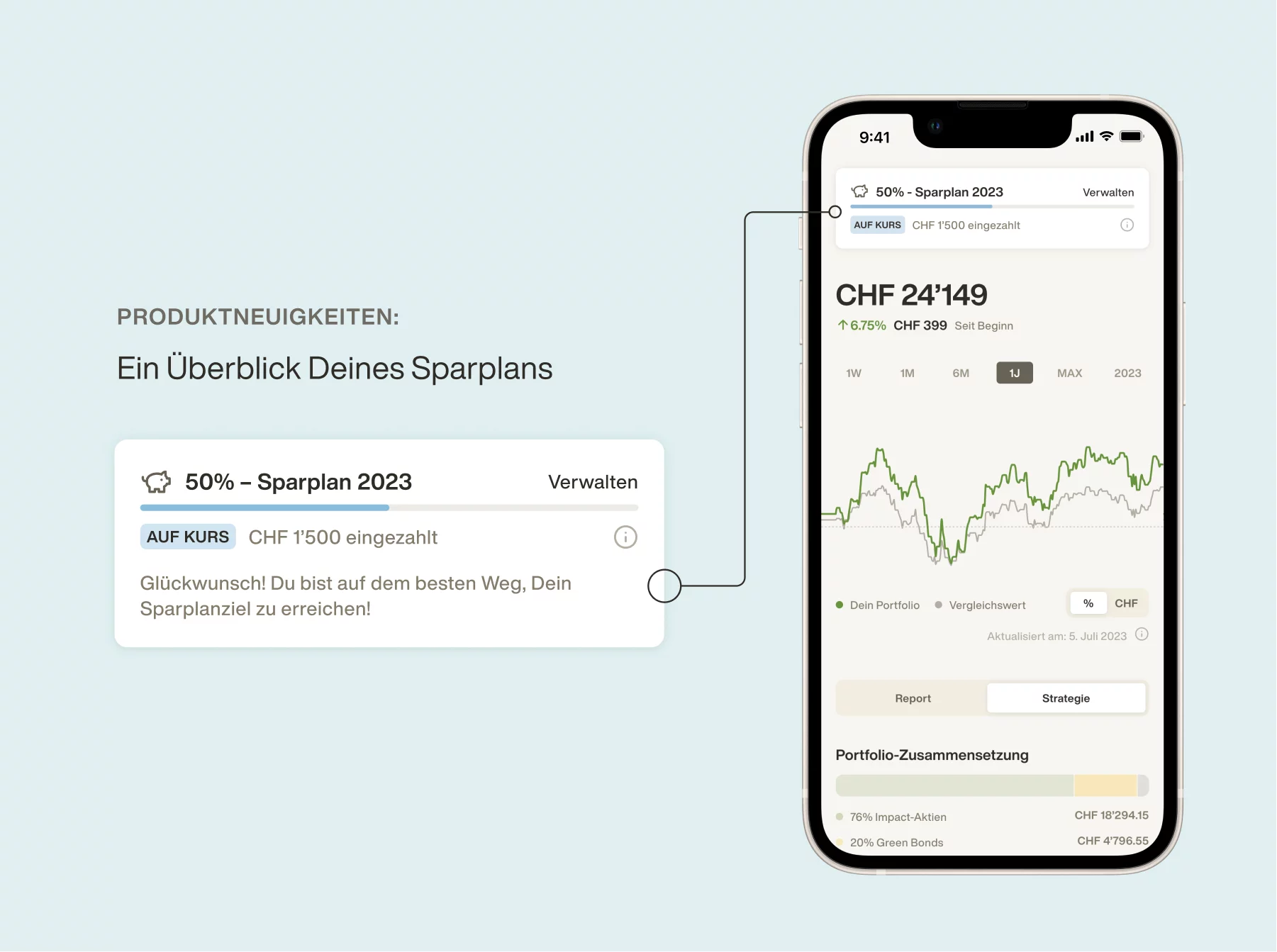 Mit der Anzeige Deines Sparplan-Status siehst Du direkt, ob Dein Sparplan “auf Kurs” ist. Du gewinnst Transparenz über Deinen Sparplan und die regelmässigen Einzahlungen. Die Anzeige erinnert Dich auch daran, wenn Du von Deinem jährlichen Fortschritt abweichst, sodass Du frühzeitig eingreifen kannst.