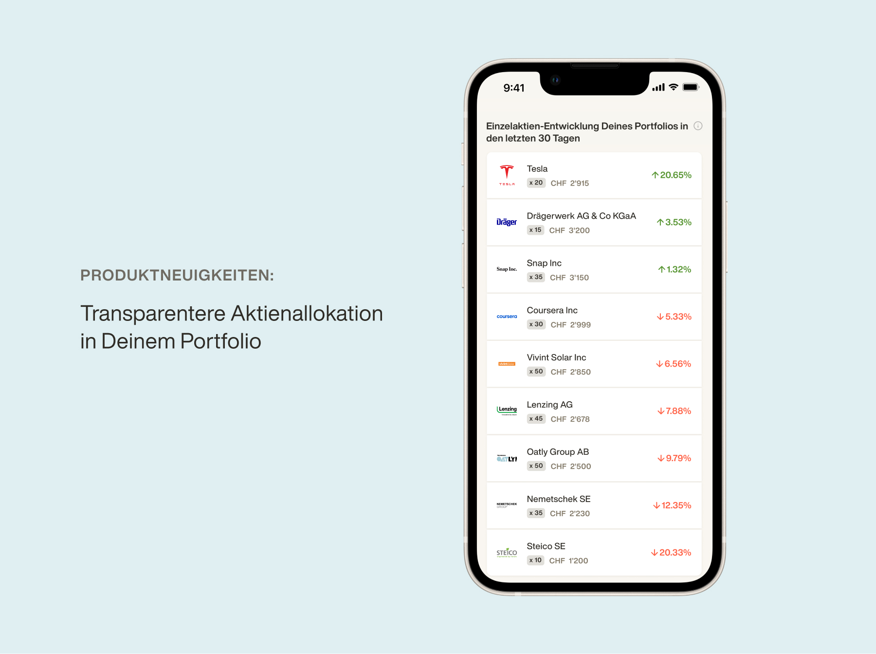 Die Übersicht der Einzelaktien gab Dir bislang einen Eindruck, wie sich die individuellen Aktien über den Zeitraum der letzten 30 Tage entwickelt haben. Neben dieser prozentualen Entwicklung zeigen wir Dir mit dem neuen Update die genaue Anzahl der individuellen Aktien in Deinem Portfolio, sowie den entsprechenden Wert der gehaltenen Unternehmensaktien. Mit dieser Erweiterung erhöhen wir die Transparenz des Aktienbestands in Deinem Portfolio.