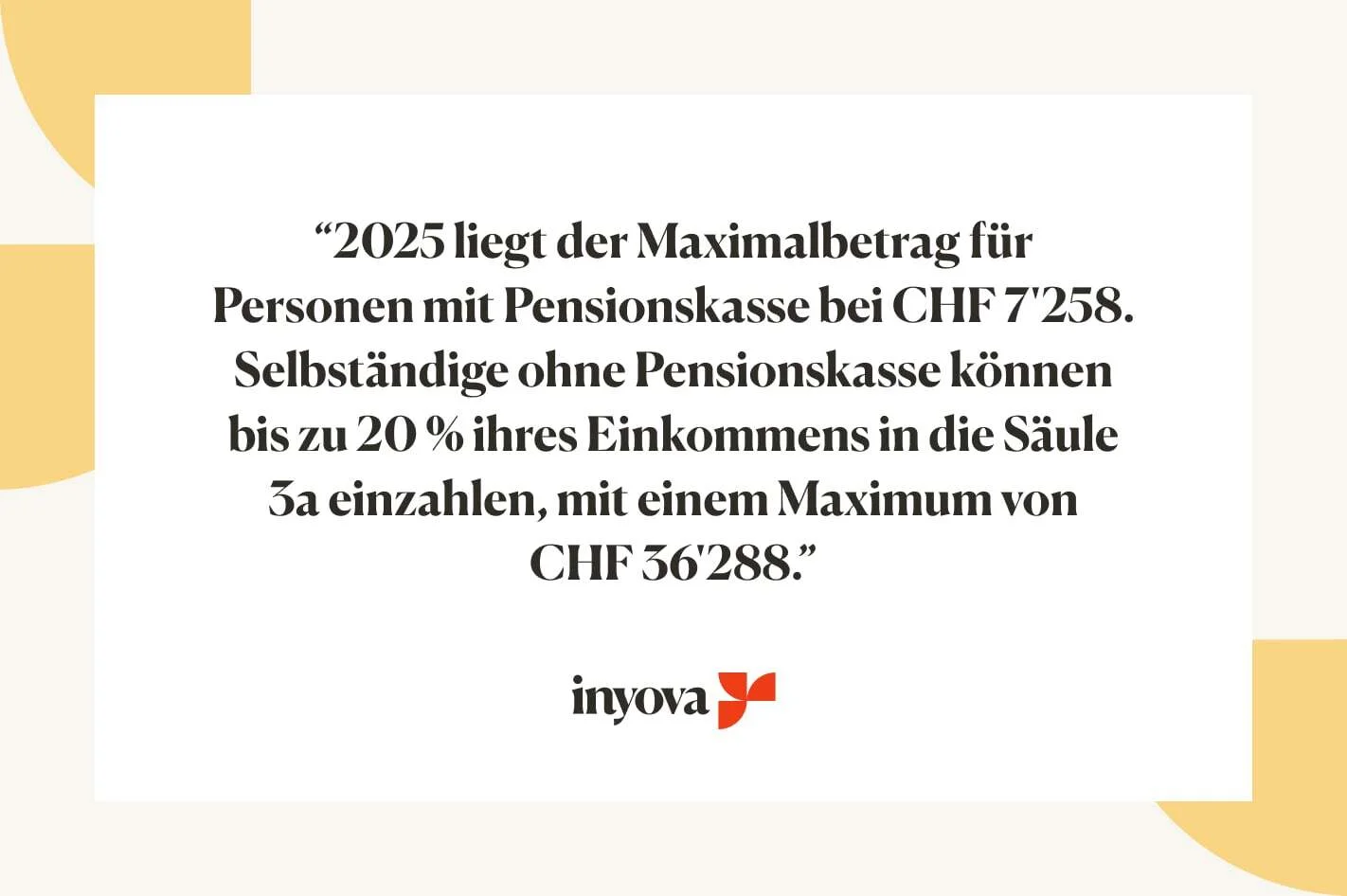 Für 2025 fallen die Betragsobergrenzen für die Säule 3a noch höher aus als für 2024. Für Personen mit Pensionskasse liegt der Maximalbetrag bei CHF 7’258. Selbständige ohne Pensionskasse können bis zu 20 % ihres Einkommens einzahlen, mit einem Maximum von CHF 36’288.