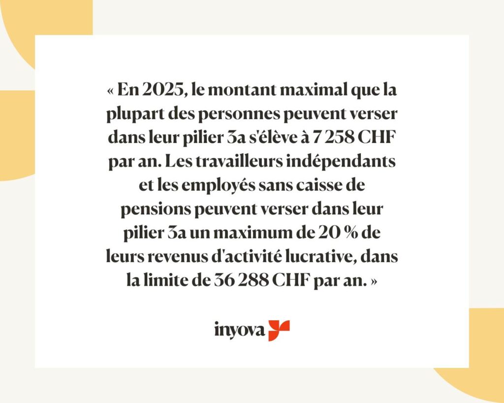 En 2025, le montant maximal que la plupart des personnes peuvent verser dans leur pilier 3a s’élève à 7,258 CHF par an. Les travailleurs indépendants et les employés sans caisse de pensions peuvent verser dans leur pilier 3a un maximum de 20 % de leurs revenus d’activité lucrative, dans la limite de 36,288 CHF par an.