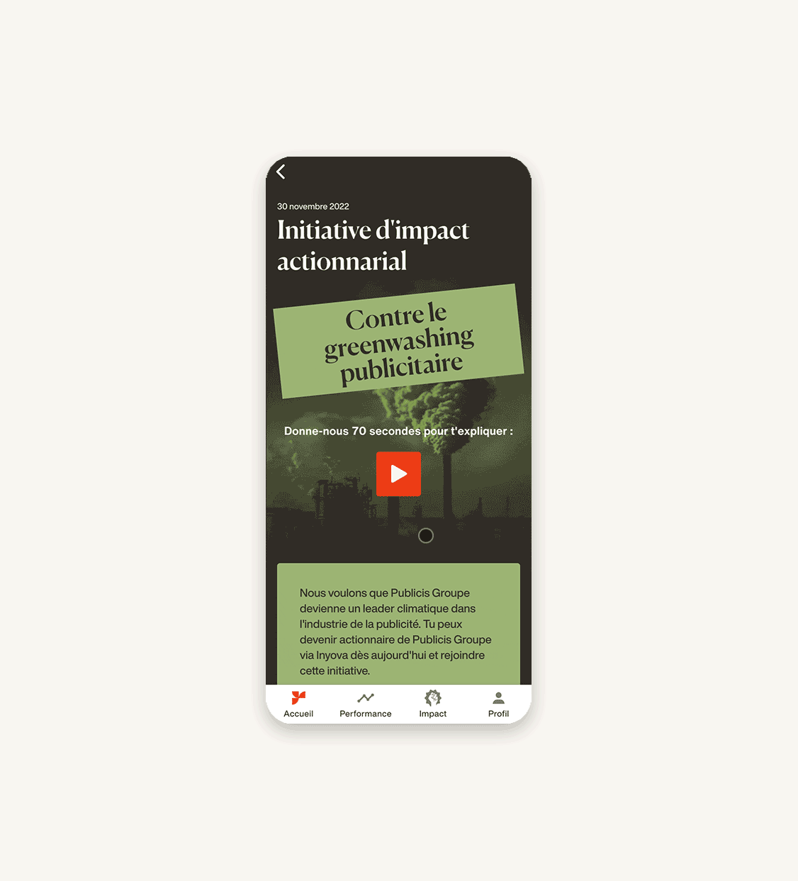 - L’investissement d’impact, par définition, consiste à trouver des entreprises où les actionnaires peuvent avoir un impact en faisant pression pour changer les choses. Nous pensons que Publicis Groupe, s’il se met sur les bons rails, peut avoir un impact majeur – non seulement en cessant de déployer ses services créatifs pour le compte d’entreprises productrices de combustibles fossiles, mais aussi en faisant office de pionnier et de modèle pour le secteur.